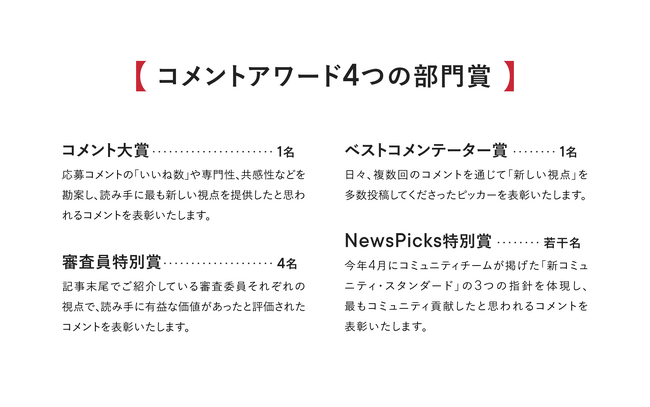 「NewsPicksコメントアワード」では、この1年で印象に残っているユーザーの皆さまからのコメントを自薦・他薦問わず推薦いただき、表彰コメントを決定いたします。
