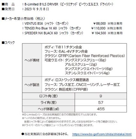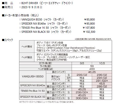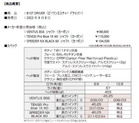 メーカー希望小売価格※2は、『B1ST DRIVER』が88,000円(VENTUS BS6 シャフト仕様)、『B2HT DRIVER』が、85,800円(VANQUISH BS50 シャフト仕様)、『B-Limited B1LS DRIVER』はカスタム専用※3モデルでVENTUS BS6 シャフト装着時の参考価格は、88,000円です。