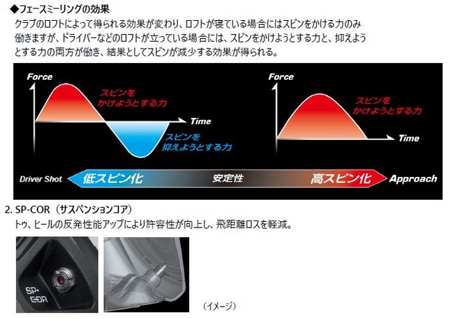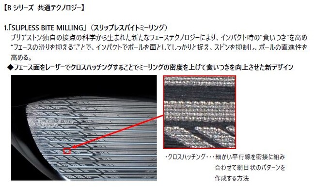 当シリーズは、様々な打撃条件やオフセンターヒット時にも安定してスピンを抑え、インパクトのパワーを逃さず伝えるブリヂストン独自の接点の科学から生まれた新たなフェーステクノロジー「スリップレスバイトミーリング」を搭載。ボールの滑りを抑える食いつくフェースにより直進性の高い飛びを追求しています。また、フェースの反発性能を高める独自技術であるSP-COR(サスペンションコア)も搭載しています。