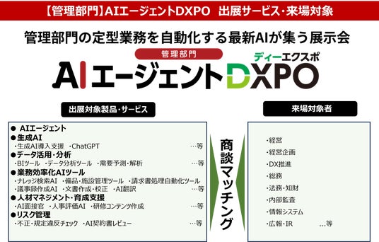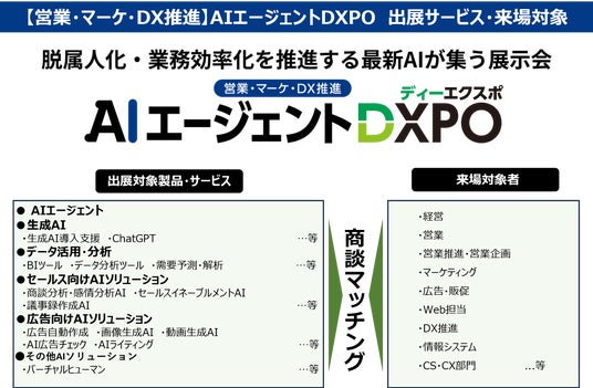 展示会事業、M&A仲介事業、人材採用支援事業を展開する、ブティックス株式会社(東京都港区、代表取締役社長 新村祐三、東証グロース上場 証券コード:9272)は、最新AIが集う展示会「【管理部門】AIエージェントDXPO」および、「【営業・マーケ・DX推進】AIエージェントDXPO」を新たに名古屋・東京2回・福岡・大阪にて年5回開催する。