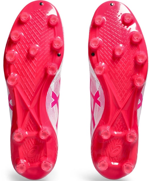 通常モデル同様、靴底にデジタル設計技術を用いることでシューズと足の一体感を高め、スプリント能力をより発揮できるようにしています。靴底は、樹脂製のプレートを大きくくり抜き軽量化をはかりながら、中部をN字型に成型することで剛性を高め、接地時のブレの原因となる過度なねじれを抑制しています。また、サッカー選手の足形や足の動きを分析し、足ゆびの関節に沿って、素早くしなやかに追従するよう剛性や形状を設計しています。さらに、つま先の先端部分には、グリップ性を高める変形円柱型スタッドとブレード型のサブスタッドを配し、蹴り出し時のパワーを最後までピッチに伝えることができるようにしています。