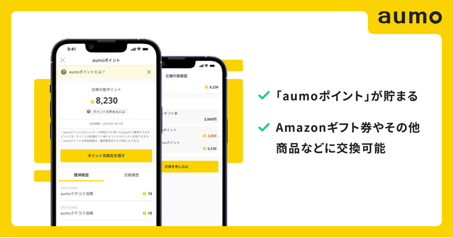 新しく追加したポイント機能は、「aumo」アプリのユーザーに「aumoポイント」を付与し、付与されたポイントをAmazonギフト券やオリジナルグッズに交換できるものです。