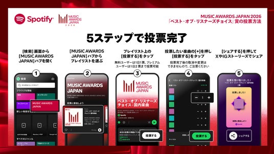 世界で7億5100万人以上が利用するオーディオストリーミングサービス Spotify(会社名 Spotify AB / 本社 Stockholm、Sweden)は、一般社団法人カルチャーアンドエンタテインメント産業振興会(CEIPA)主催の国内最大規模の音楽賞「MUSIC AWARDS JAPAN」(以下、MAJ)の一般投票部門において、Spotifyユーザーの投票により受賞作品が決定する「ベスト・オブ・リスナーズチョイス」2部門と、主要6部門のひとつ「Best Global Hit from Japan」の投票を、2026年3月19日より開始することをお知らせいたします。