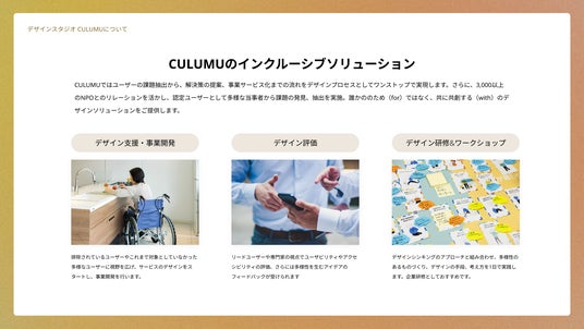 CULUMUのインクルーシブソリューションは「デザイン支援・事業開発」、「デザイン評価」、「デザイン研修&ワークショップ」などがあります。