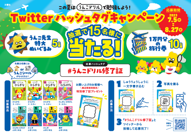 対象商品ご購入でもらえる「うんこドリル修了証」に、「この夏に覚えた好きな漢字1文字」を書いてTwitterで投稿すると、抽選で合計15名様にプレゼントが当たります。