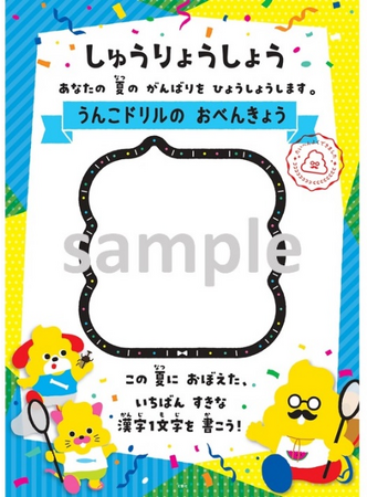 また、実施書店では「うんこドリル」シリーズの店頭フェアを開催し、店頭で対象商品をご購入いただいた方には、ノベルティとして「うんこドリル修了証」を、各店お買上先着10名様を対象に「うんこドリル金銀シール」をプレゼントします。さらにノベルティの「うんこドリル修了証」に、この夏に覚えた好きな漢字1文字を書き加えてTwitterに投稿することで、抽選でプレゼントが当たるTwitterハッシュタグキャンペーンも同時開催します。