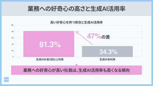 生成AIを週1回以上利用する社員の81.3%が高い好奇心を持つのに対し、未利用者では34.3%で、47.0ポイントの差が確認されました。また、企業文化についても、好奇心が高い社員の91.5%が「好奇心を育てる文化が豊か」と回答した一方、好奇心が低い社員では37.9%にとどまりました。
