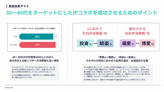 マンガやアニメ、キャラクターなどのIPについて、30~40代の94%が好意的な反応を示しており、企業とのコラボ企画にも好意的な印象を示していることがわかりました。
