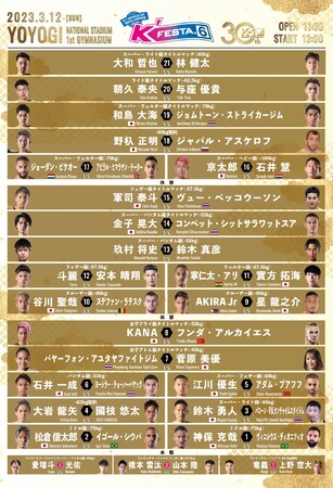 K-1/Krushの運営及びジム運営するK-1実行委員会(東京都渋谷区、 プロデューサー:中村拓己)は、2023年3月12日(日) 国立代々木競技場 第一体育館で開催する、K-1が年に一度開催している年間最大のビッグマッチ「K-1 WORLD GP 2023 JAPAN~K’FESTA.6~」大会を開催いたします。