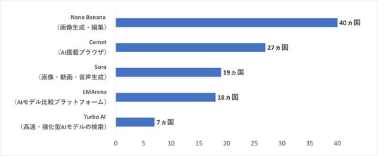 特に画像の生成や編集を可能とする「Nano Banana」を示すキーワードは、今回の調査対象である40カ国・地域すべての検索キーワードランキングにランクインしました。その他、動画の生成を可能とする「Sora」を示すキーワードが19カ国、AIモデルごとに画像の比較などを可能とする「LMArena」は18カ国・地域の検索キーワードランキングにそれぞれランクインしました。