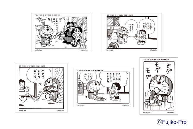 "食べる"シーンをテーマに5種類のひとコマシールをご用意しました。なかにはレアなのび太くんのおじいちゃんの姿も…?