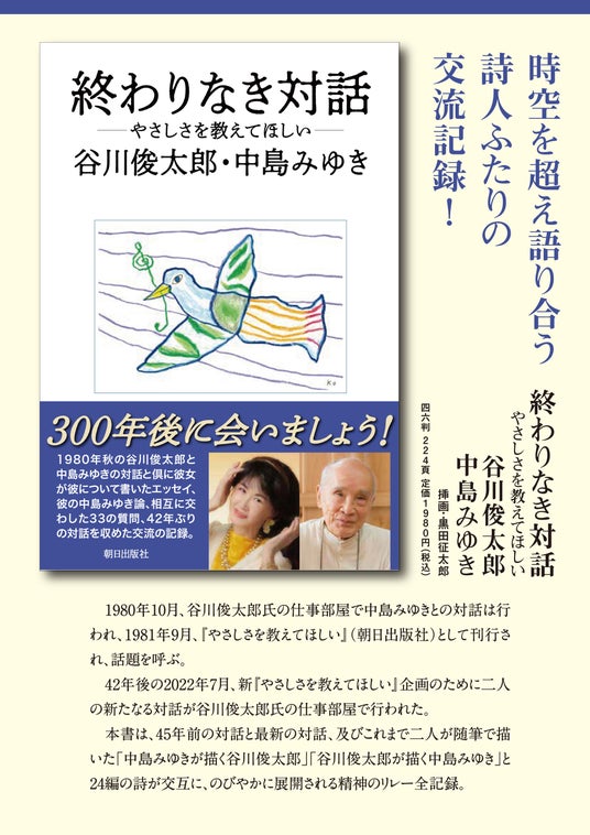 株式会社朝日出版社は、『終わりなき対話 やさしさを教えてほしい』(谷川俊太郎 著 / 中島みゆき 著)を、4月15日(火)に発売いたしました。