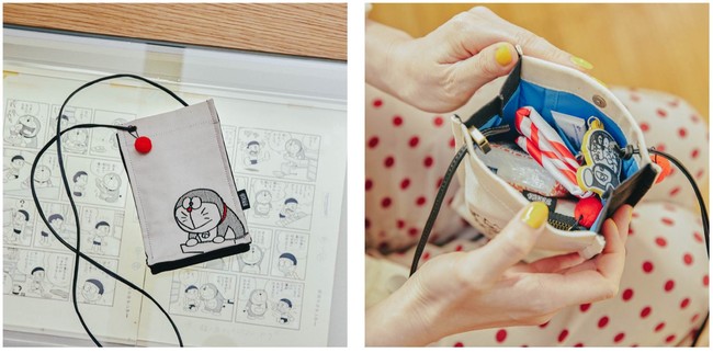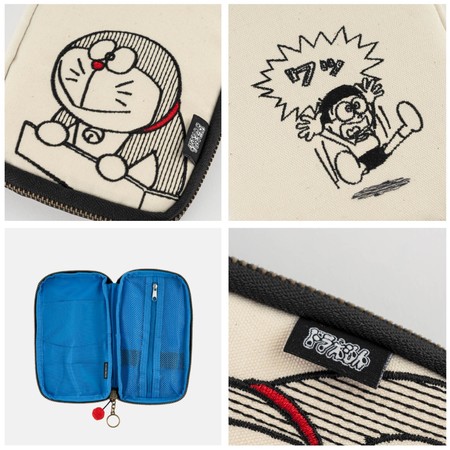 まんがの中でドラえもんが「初登場」するシーンを刺繍で再現し、モノトーンベースの色合いでシックなポーチに仕上げました。おもてには、机の「ひきだし」から出てきたドラえもん。そして裏には、びっくりして飛び上がるのび太くん。まさに「ひきだし」ポーチにぴったりなシーンです。かたちは全部で6種類あります。