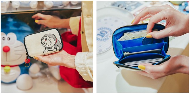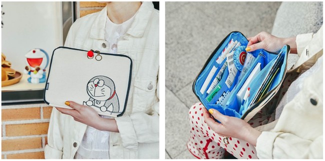今回新登場するデザインは、タイムマシンに乗って22世紀からやってきたドラえもん。外側はドラえもんが初登場するシーンを刺繍で再現し、白の帆布素材と黒のファスナーでシンプルに仕上げました。遊び心も忘れず、内側は鮮やかなドラえもんカラーに。引き手部分にはドラえもんのしっぽのような丸いチャームもつけました。黒字に白文字で「ドラえもん」のロゴが入ったタグもポイントです。