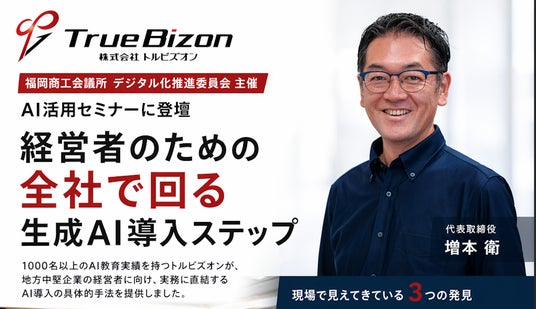 株式会社トルビズオン(本社:福岡県福岡市、代表取締役:増本衛)は、2026年4月16日(水)に福岡商工会議所デジタル化推進委員会が主催するAI活用セミナーに登壇しました。「経営者のための全社で回る生成AI導入ステップ」と題した本セミナーでは、業務分解に基づく設計手法や経営者が主導して全社でAIを活用するための5ステップを解説しました。
