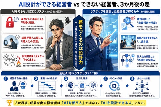 現場ではすでに一部の社員がAIで成果を出している一方、組織として把握できなければ再現も横展開もできません。できる人だけが進み、組織が分断されるこの状態を解消するには、ツール導入の前に「経営者が設計する」ことが不可欠です。