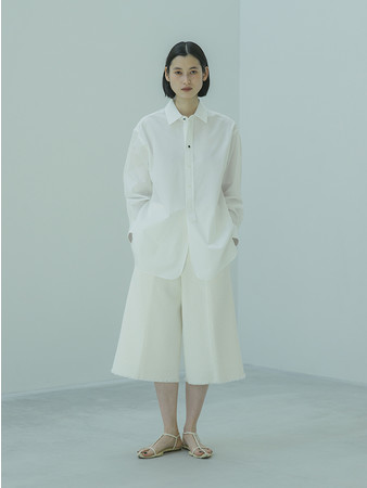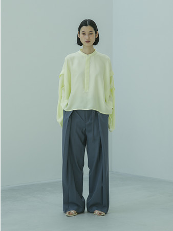細番手のシルク糸で織り上げた生地の光沢感としなやかさが特徴のブラウスです。生地幅を活かしビックシルエットに仕上げました。生地を無駄にしない、というのもブランドのアイデンティのひとつです。