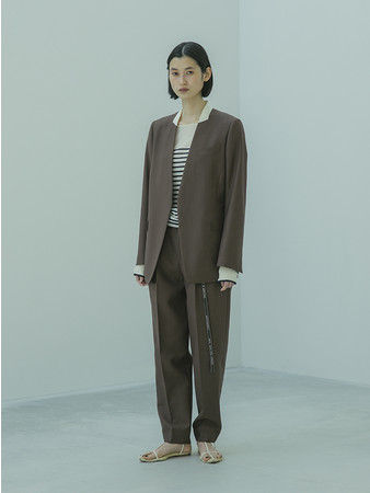 ノーカラジャケットのセットアップスーツ。ウールとモヘアのブレンド糸で平織りした生地は軽量な上、シワになりにくいのが特徴。ジャケットはストレートシルエットにこだわり少し辛めのパターンで仕上げています。パンツは股上の深さをしっかりとり、ゆとりのあるテーパード。肌のあたりを良くるすために裏地にはシルクを使用しました。