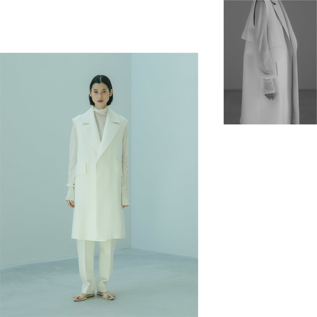 たて糸がシルク×よこ糸がウールの二重織素材。シルクの張り感と軽さにウールで膨らみをプラスした構築的なボックスシルエットのオーバーサイズジレ。やわらかなクリーム色が優しい表情を演出します。