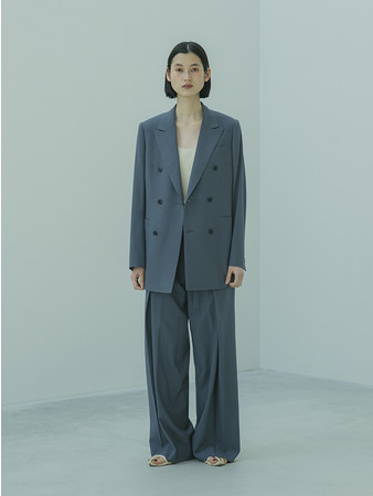 シーズンレスに楽しみたい個性引き立つグレーサックスのニュアンスカラーをチョイス。ソフトなピークドラペルのダブルブレステッドジャケットは適度なオーバーサイズと抜け感で、オンオフどちらにも対応。単品でも重宝するアイテムです。