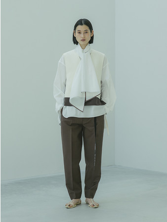 ゆるみのあるボクシーシルエットのプルオーバーベスト。裾には厚みのあるサテン生地を使用し、ブラウンとのバイカラーがデザインポイント。ドロップショルダーのビッグシルエットブラウスは、デチャッタブルのボータイ付。1枚で存在感のあるアイテムです。