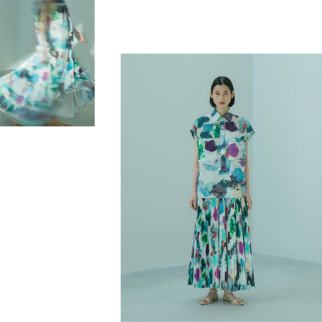 象徴的な水彩ペイントはイタリアのコモ湖でプリントを施しました。美しいアコーディオンプリーツは女性のしなやかな動作を強調。スカートのスリットから覗くライナーにはアセテートのシワ加工素材を用い、清涼感の心地よい肌触りが気持ちを落ち着かせてくれます。