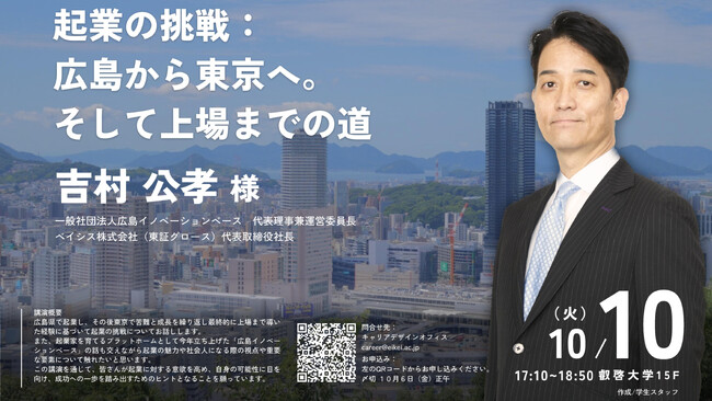 叡啓大学(広島市中区、学長:有信睦弘)では、学生のコンピテンシー育成及びキャリア形成支援の一環として、社会で活躍中の第一人者をお招きして「イブニングラウンジ」を開催しています。