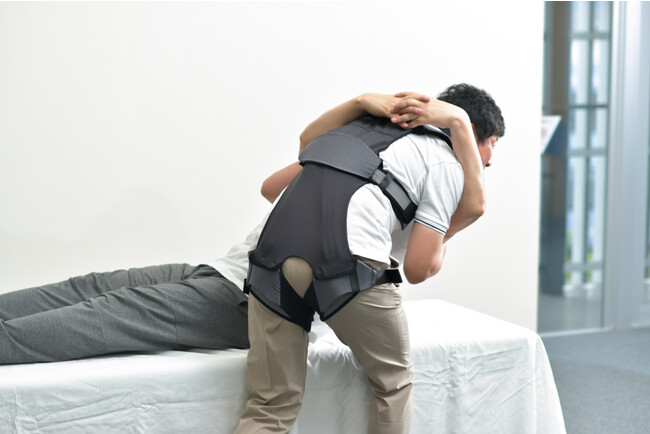 衣服のようなアシストスーツで、肩から腰と脇から腰にかけて特殊高反発ゴムを、腰から大腿部にかけて特殊高反発ゴムと人工筋肉を配置しています。中腰姿勢を維持するときに使う背面の筋肉をサポートし、長時間中腰姿勢で作業する場合などに長時間の姿勢保持がラクになるよう設計されています。