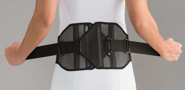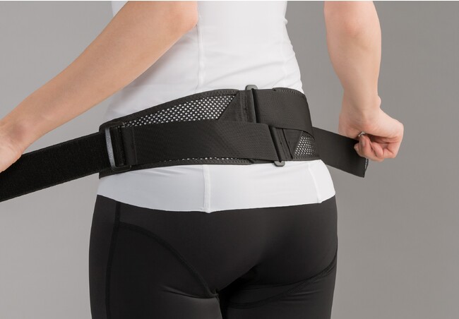 左右のベルトを軽く引くだけで本体背部が中心に寄り、腰をガッチリ固定します。全面非伸縮素材を使用しているため、固定力、圧迫力が高く、腰に安定感を与えます。