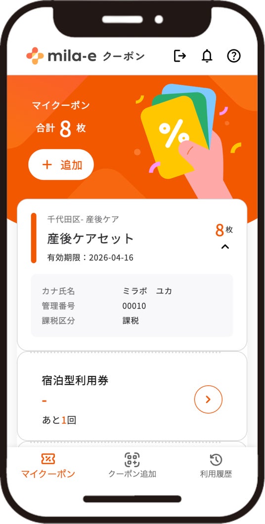 mila-e クーポンは、デジタルクーポンサービスです。産後ケアなどの デジタルクーポン・回数券を発行し、 利用状況をリアルタイムで確認できます。