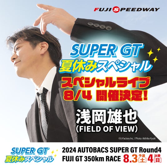 浅岡雄也さん(FIELD OF VIEW)には、決勝レース前、ホームストレート上16番ピット前付近に設置する特設ステージからグランドスタンド席に向かって、サポートメンバーと共にライブパフォーマンスを行っていただき、レースのスタートを待つグランドスタンド席の皆様、そして出場する選手やチームを熱く盛り上げていただきます。