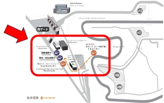イベント広場から1周4,563mのレーシングコースに隣接する各駐車場、ウェルカムセンター、ホテル、ミュージアムを巡回する『場内シャトルバス』にご乗車いただけます。