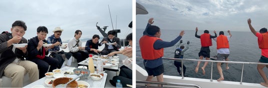 普段は職種が異なるため交流の少ない社員同士も、いーふらんの福利厚生制度を通じて交流の機会を持つことができました。船上では笑顔で会話が弾み、和気あいあいとした雰囲気に包まれていました。また、代表取締役会長・渡辺喜久男も社員に交じって海へ飛び込むなど、アクティビティに積極的に参加。 社員との距離がぐっと縮まる交流の場となりました。