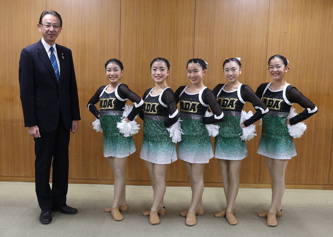 この日、5人は全国大会出場の報告のため市役所を訪問。キャプテンを務める扇谷さんが「もっと練習して全国大会でも上位の成績を残せるよう頑張ります」と意気込みを話し、濱田市長は「保護者の皆さんや講師の先生への感謝の気持ちを忘れず、ベストを尽くしてください」と激励しました。