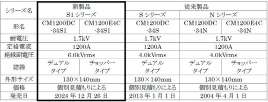 三菱電機株式会社は、鉄道車両・直流送電などの大型産業機器向け耐電圧1.7kVパワー半導体モジュールの新製品として、「HVIGBT(※1)モジュールS1シリーズ」の2製品を12月26日に発売します。独自のIGBT素子と絶縁構造の採用により、信頼性向上および電力損失と熱抵抗の低減を実現し、大型産業機器向けインバーターの高信頼性・高効率化に貢献します。