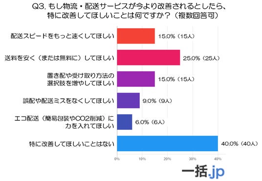 - 最も多かったのは「特に改善してほしいことはない」(40.0%、40人)で、物流・配送サービスについて現状のサービス内容で十分と感じている利用者が多いことがわかります。これまでのサービス品質や利便性に一定の満足感を抱いている層が、一定割合存在することがうかがえます。