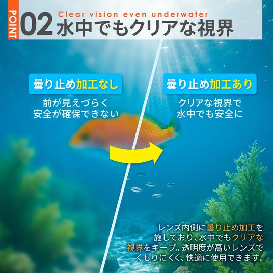 レンズの内側に施されたくもり止め加工により、水中でも高い透明度をキープ。前方が見えにくくなる心配がなく、クリアな視界を実現します。