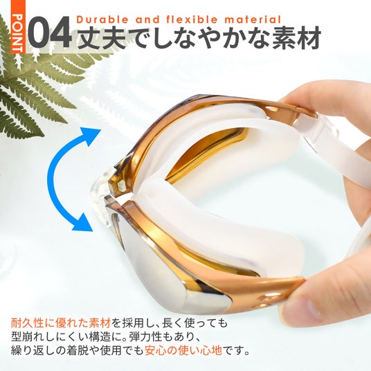 柔らかい3Dシリコンフレームが目元をやさしく包み込み、顔にしっかりフィット。水の侵入を防ぎながら、長時間つけていても痛くなりにくい構造です。