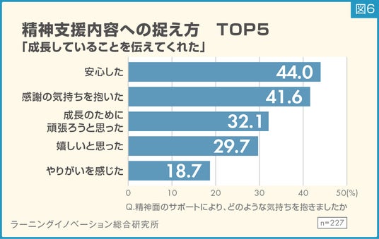 成長していることを伝えてくれた「成長していることを伝えてくれた」という精神支援内容では、「安心した」が44.0%と最大の割合となりました。他の項目と比較した際、「感謝の気持ちを抱いた」(41.6%)や、「成長のために頑張ろうと思った」が(32.1%)が突出する結果となったことが特徴です。(図6)