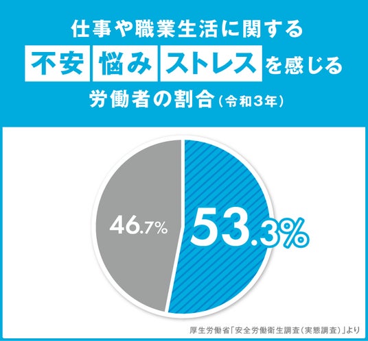 日本で深刻化する少子高齢化に伴う労働力不足を背景に、企業が成長していくためには、組織の要でもある労働者一人ひとりの能力を最大限に発揮していくことが必要不可欠です。しかし、厚生労働省の調査結果(*3)によると、仕事や職業生活に関する強い不安、悩み、ストレスを感じる労働者の割合は、半数を超えるといわれています。