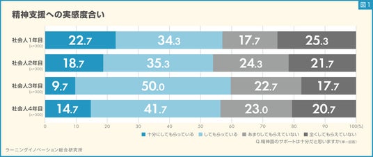 一方、「全くしてもらえていない」と回答する割合は、社会人1年目が25.3%と最大となり、4人に1人が全く精神支援されていないと感じている実態が明らかとなりました。(図1)