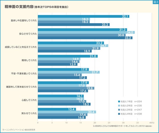 社会人4年目では、「安心させてくれた」(33.2%)、「励ましや応援をしてくれた」(25.2%)、「成長していることを伝えてくれた」(18.9%)と続きました。(図3)
