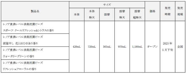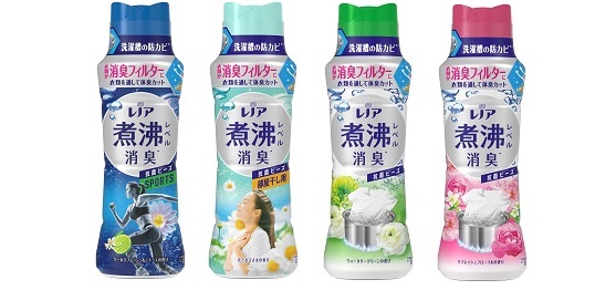 「レノア煮沸レベル消臭抗菌ビーズ」は、パッケージ、製品名を共に刷新し、「レノア煮沸レベル消臭抗菌ビーズ スポーツ クールリフレッシュ&シトラスの香り」「レノア煮沸レベル消臭抗菌ビーズ 部屋干し 花とおひさまの香り」「レノア煮沸レベル消臭抗菌ビーズ ウォータリーグリーンの香り」「レノア煮沸レベル消臭抗菌ビーズ リフレッシュフローラルの香り」のラインアップで販売します。