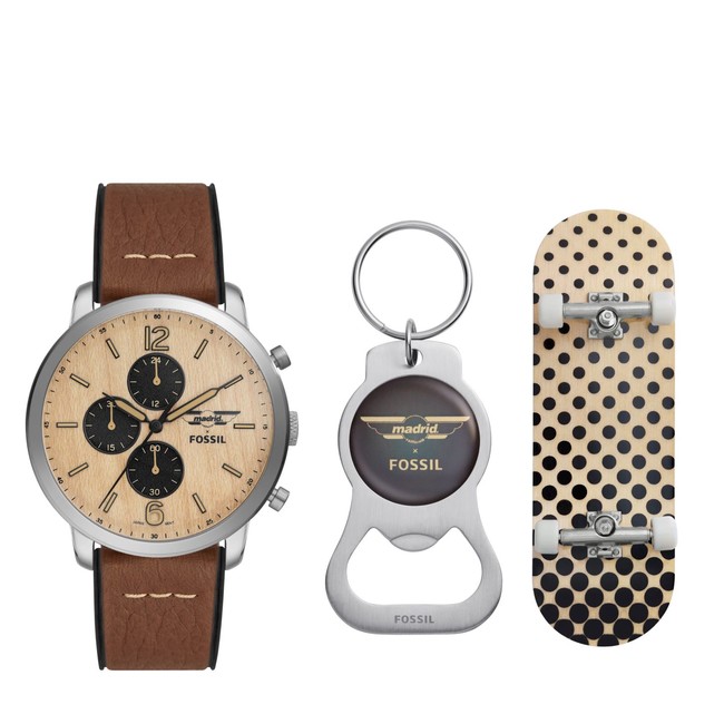 マドリッド x フォッシル ニュートラ クロノグラフ(44mmケース)は、メープルウッドのベニヤダイアルに、デッキテープ(Griptape) テクスチャーのサブアイ、エコレザーを使用したブラウンカラーのストラップが特徴です。このボックスセットには、ブランドロゴ入りのボトルオープナーと、1:8スケールのフィンガーボード、シリアルナンバー入りのプレートが同梱されています。ボックスにはメープルウッドのベニヤを使用し、デッキテープやマドリッドの80年代のグラフィックを彷彿とさせるドット模様があしらわれています。