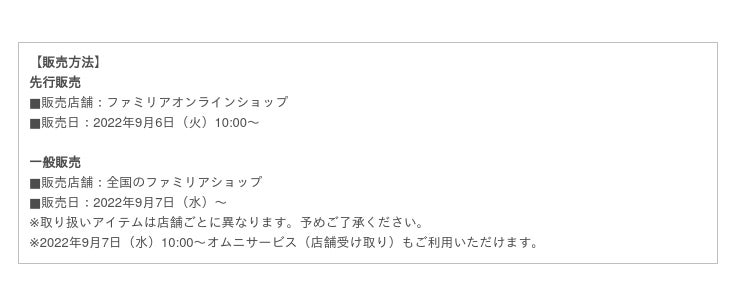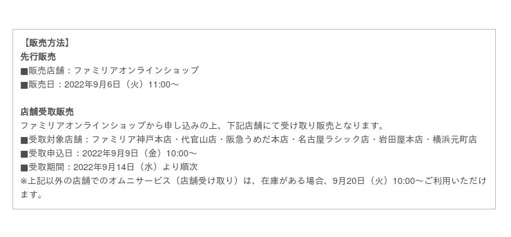 2022年9月6日(火)よりファミリアオンラインショップにて販売開始、9月9日(金)よりファミリア神戸本店・代官山店・阪急うめだ本店・名古屋ラシック店・岩田屋本店・横浜元町店にて店舗受取販売開始
