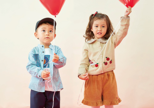 9月は旬のリンゴをモチーフにした、秋らしい落ち着いた色合いのコレクションを企画。80cm~160cm共通で、初秋から長く着回しができる新作スタイルを展開します。
