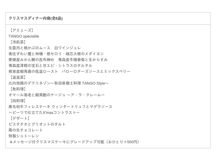 株式会社一家ホールディングスの連結子会社である株式会社一家ダイニングプロジェクト(本社:千葉県市川市、代表取締役社長:武長 太郎 以下当社)が運営する運営するレストランTerrace Dining TANGO(テラスダイニングタンゴ 東京都港区)は、2021年12月23日(木)~25日(土)までの期間限定で、毎年ご好評いただいているクリスマスディナープランを販売いたします。