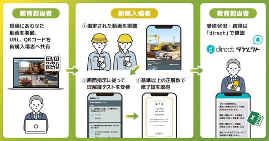 そこで、現場で実施している対面教育のうち、「教育動画」の視聴と「理解度テスト」の受検をWeb上で実施できる環境を構築し、複数の現場で有効性を確認しました。具体的には、教育の対象となる新規の技能者が、現場に入場する前に各自が所有しているパソコンやタブレット・スマートフォンで「教育動画」を視聴し、続けて「理解度テスト」を受検します。基準となる合格ラインを超えるとWeb上での教育が終了したことになり、後日、対面教育や書類確認等のみ現場で実施します。