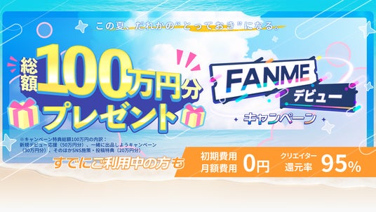 クリエイターDXカンパニーである株式会社TORIHADA(本社:東京都渋谷区、代表取締役社長:若井 映亮)が開発・運営するクリエイターコンテンツ販売サービス「FANME(ファンミー)」は、この度、FANMEでの活動開始を検討しているクリエイターを強力に応援するため、新規販売者には売上の95%(※1)を還元し、さらに抽選で総額100万円分の特典をプレゼントする「FANMEデビューキャンペーン」を2025年7月1日(火)より開催いたします。本キャンペーンを通じて、クリエイターの皆様がFANMEでスムーズにデビューし、活動を大きく広げるための機会を提供します。