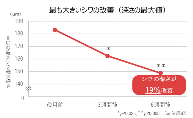 RJとナイアシンアミドを配合したエイジングケア美容液を6週間使用することで、使用前よりも<シミの個数><目尻のシワの深さ、面積、体積>が改善しました。